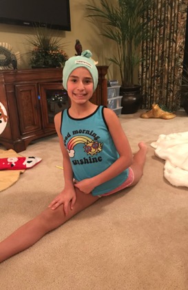 Kayleigh is on our 8U Pre-Competitive team. Coach Vanessa says Kayleigh is a very hard working athlete. She is always working towards being faster, stronger, more flexible and extended. She listens well, and tries hard no matter how cold she is! Both her right and left splits are getting flatter each week. Keep up the good work, Kayleigh!