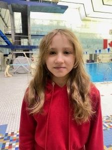 Ayva is a member of our 12U Blue team.  Ayva has been working extremely hard to improve her figure and routine skills. She has made great improvements in her splits on land and her support scull. Coach Jojo says Ava always works hard and has fun at practice!